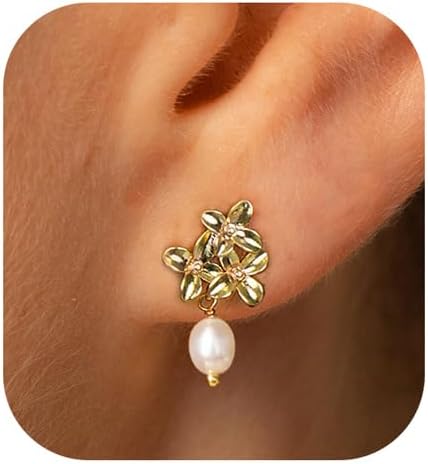 Gold Pearl Flower Stud Earrings for Women Dangling, 14k Gold Plated Small Dainty Pearl Drop Earrings Studs Pearl Dangle Dangly Earrings for Women Gold Jewelry Non Tarnish