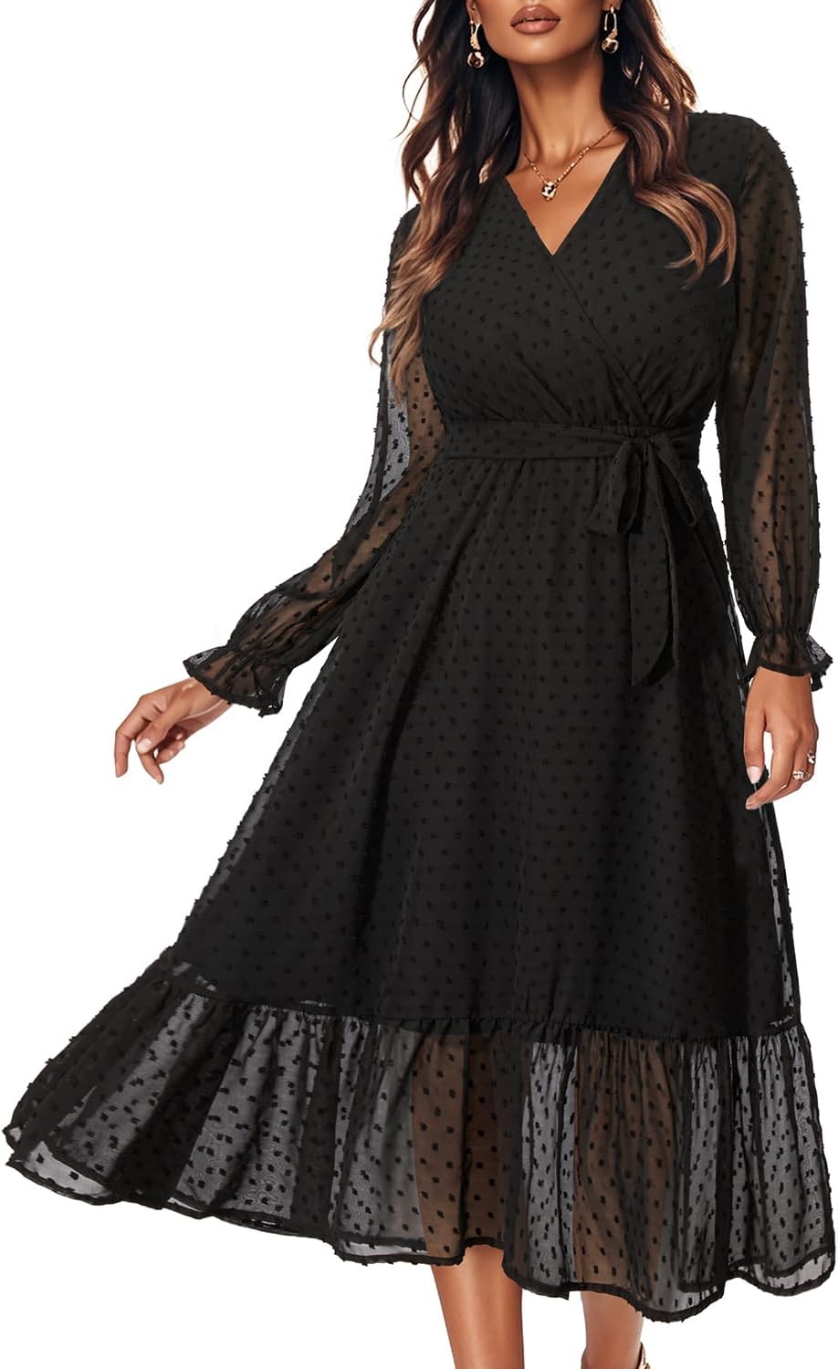 Women's Fall Long Sleeve Spring Dress Wrap V Neck Swiss Dot Casual A-Line Midi Dresses with Belt