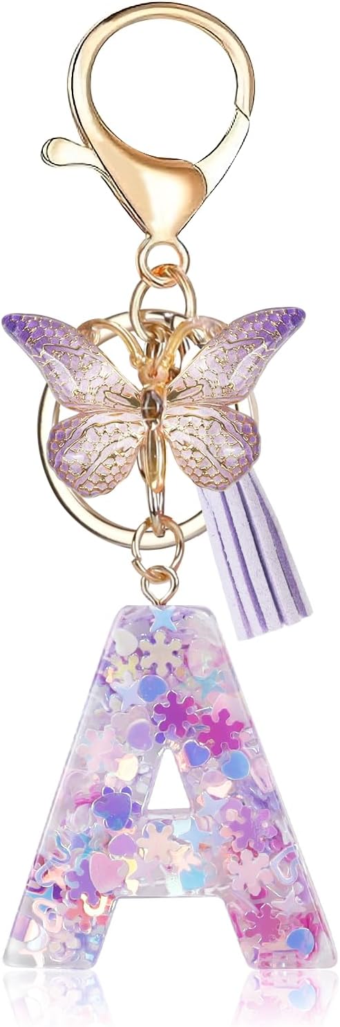 Fmeida Initial Letter Keychains for Women Cute Purple Keychain with Tassel& Butterfly