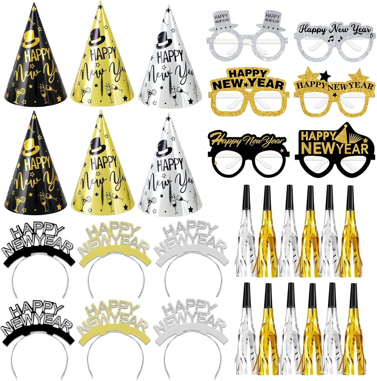 36 Pieces 2026 New Years Eve Party Supplies Include 6 Happy New Year Cone Hats 6 Glitter Tiaras 12 New Years Paper Eyeglasses and 12 Gold Silver Noise Makers for 2025 Happy New Year Party Decorations