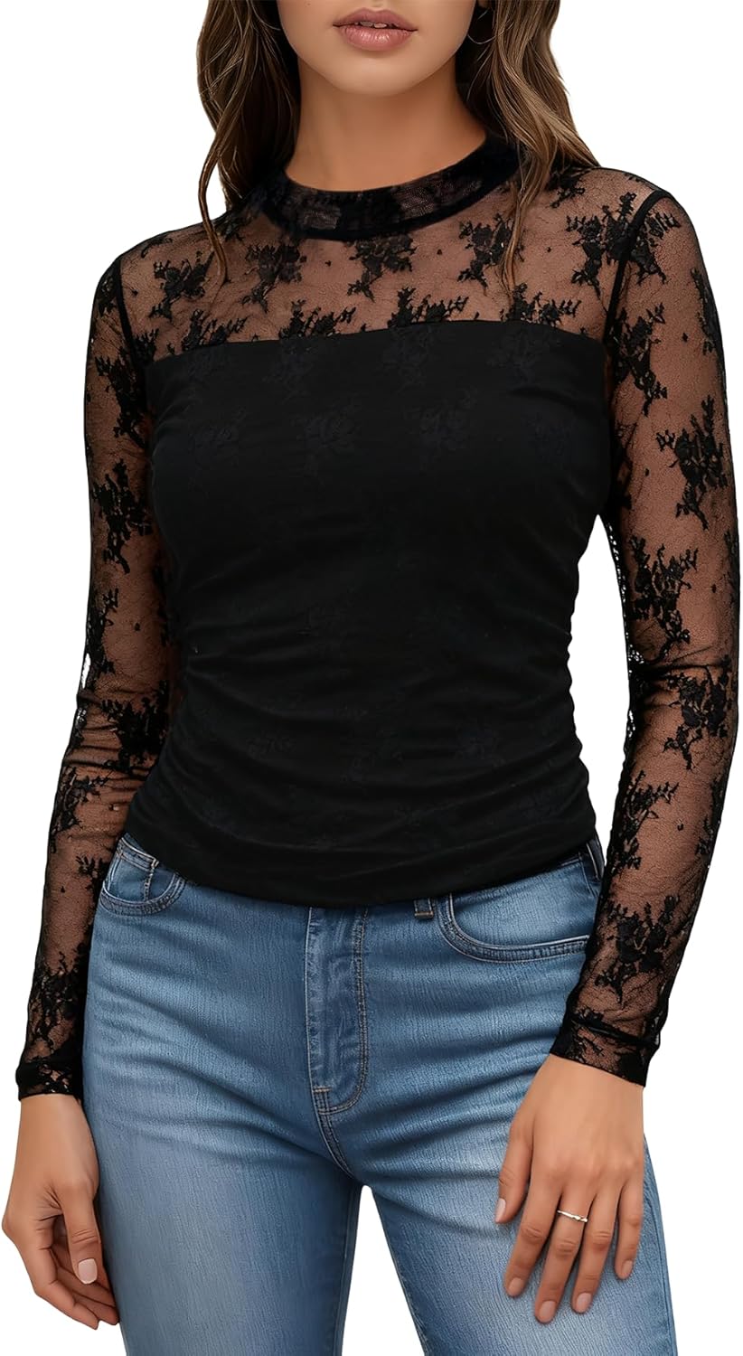 Jenbou Women’s Long Sleeve Lace Tops Crew Neck Mesh Sheer Shirts Going Out Tops