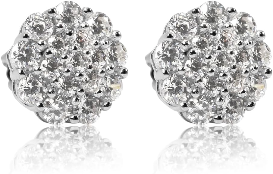 Flower Cluster White Gold Plated 925 Sterling Silver Screw Back Post Large Men’s Women's Iced CZ Round Honey Comb Set Hypoallergenic Circle Hip Hop Trendy Fashion Big Cubic Zirconia Stud Earrings