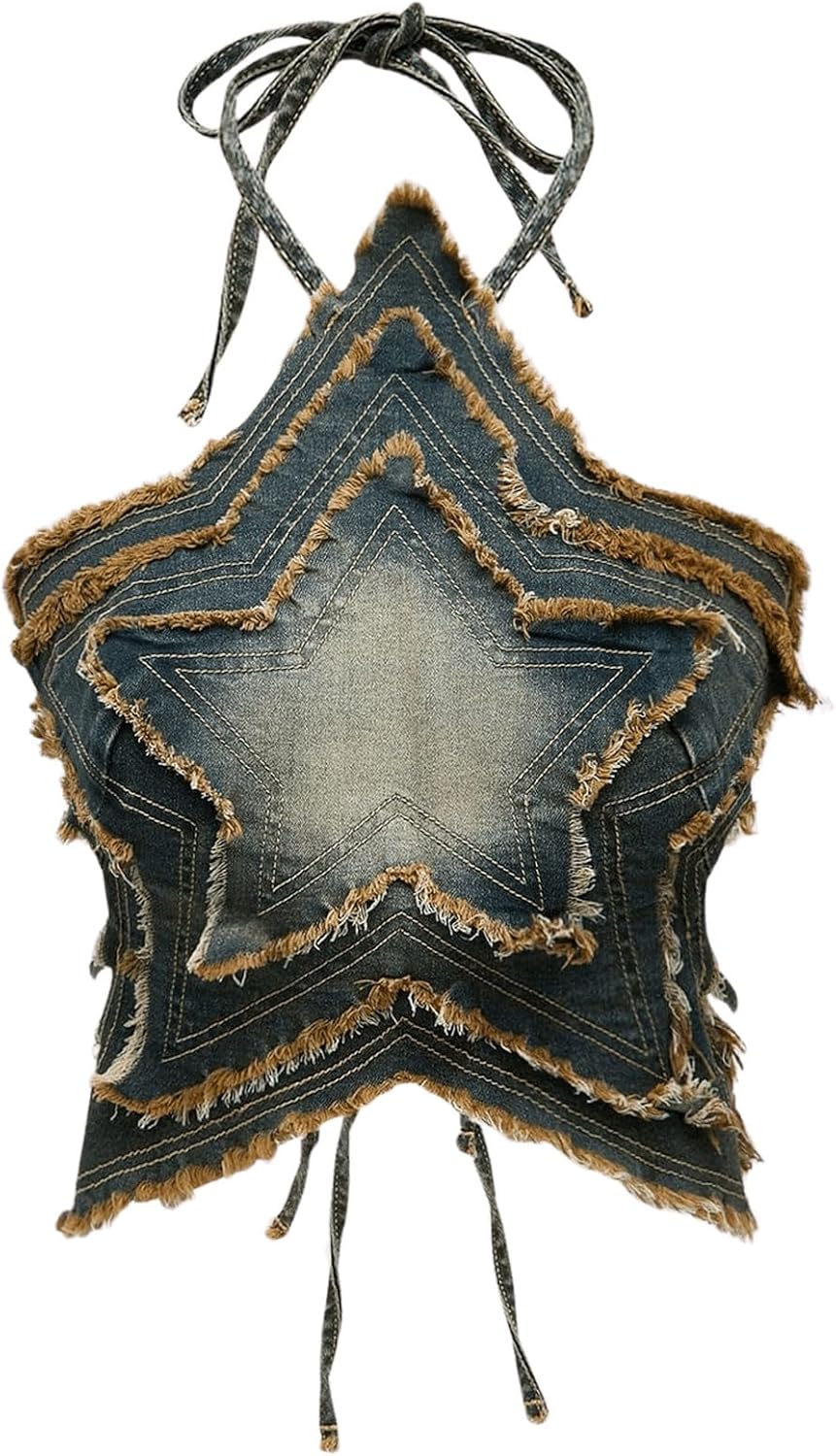 MakeMeChic Women's Denim Halter Tops Y2K Backless Raw Hem Tie Back Crop Party Club Tops