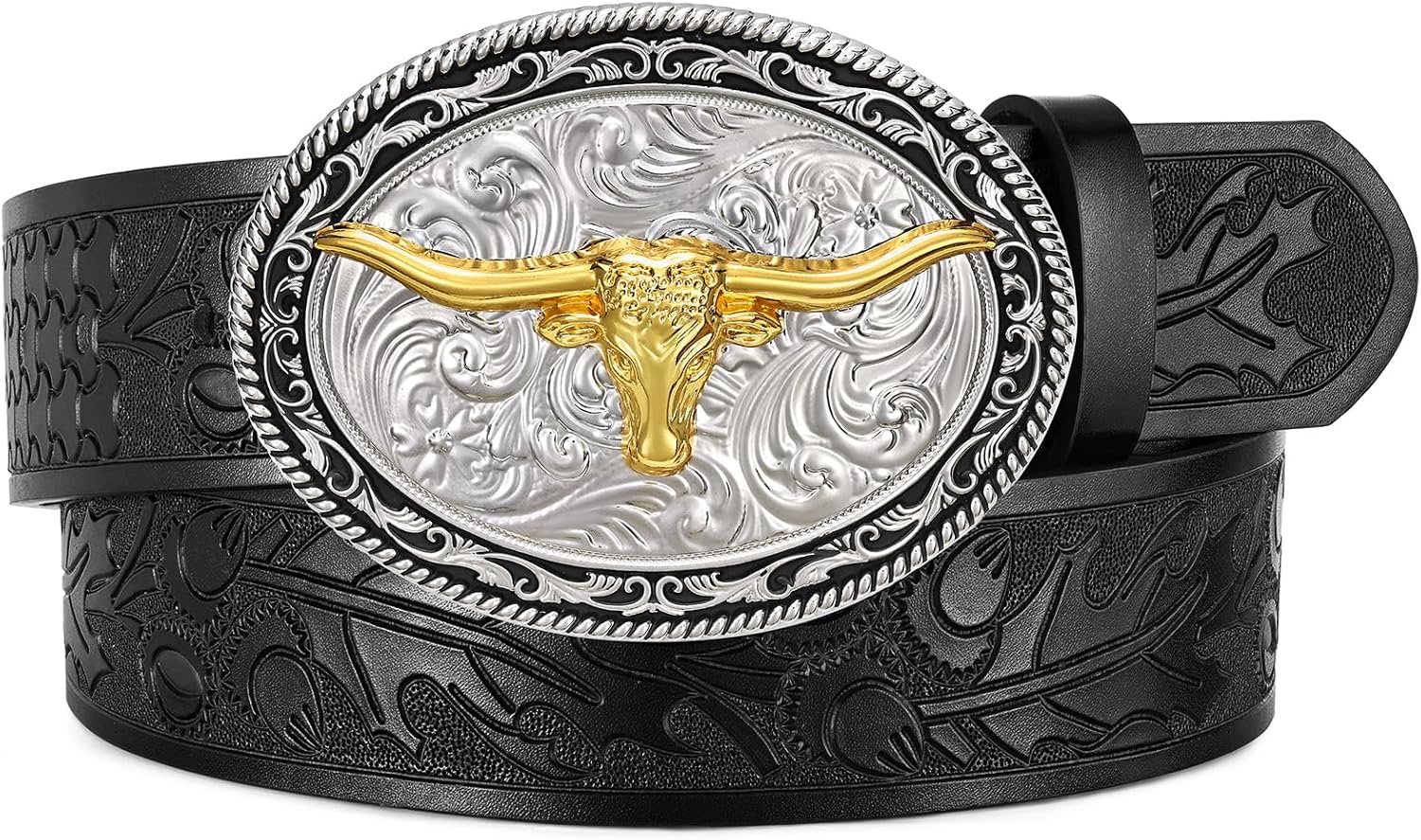 Western Cowboy Belt for Men Women, Country Longhorn-Bull Horse Buckle Embossed Leather Belt for Jeans Gift