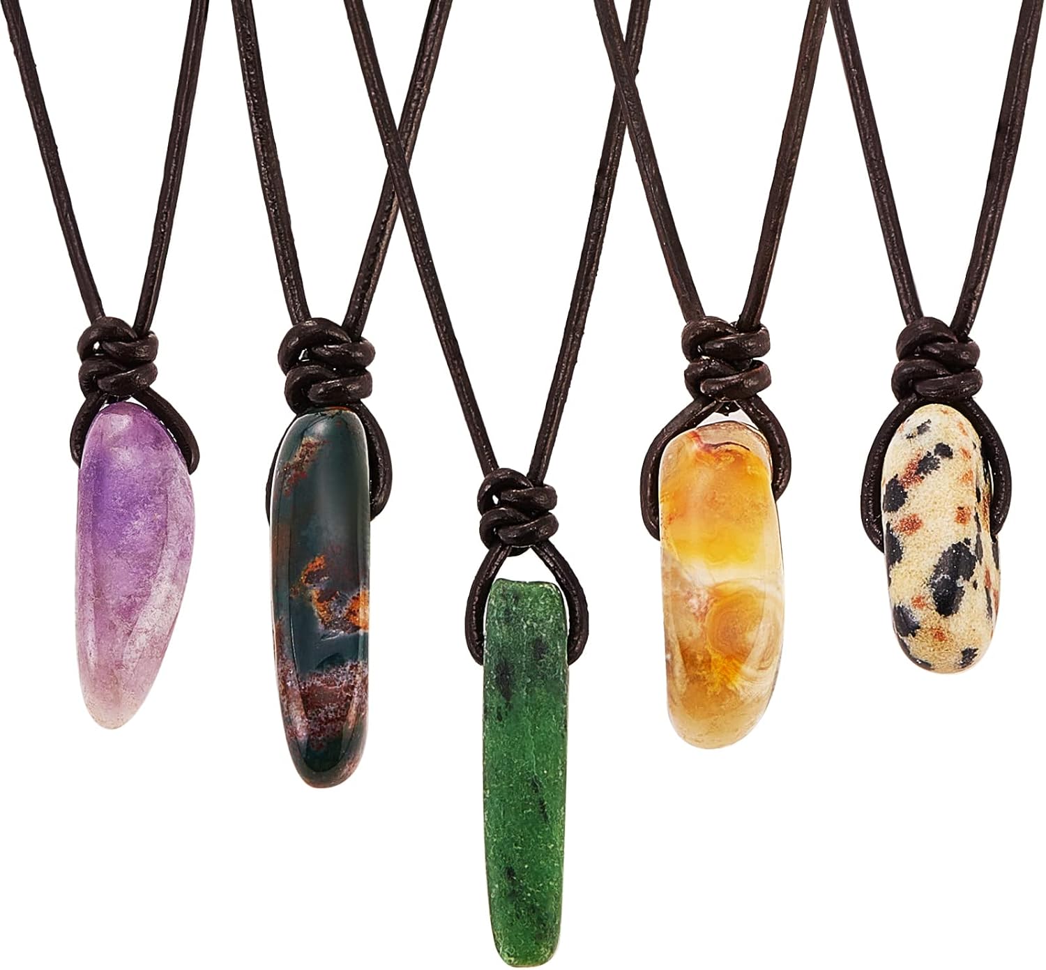 Ornaland 5 Pcs 5 Styles Natural Mixed Gemstone Pendant Necklace Adjustable Crystal Stone Charms Necklace with Cowhide Leather Cord Jewelry for Women