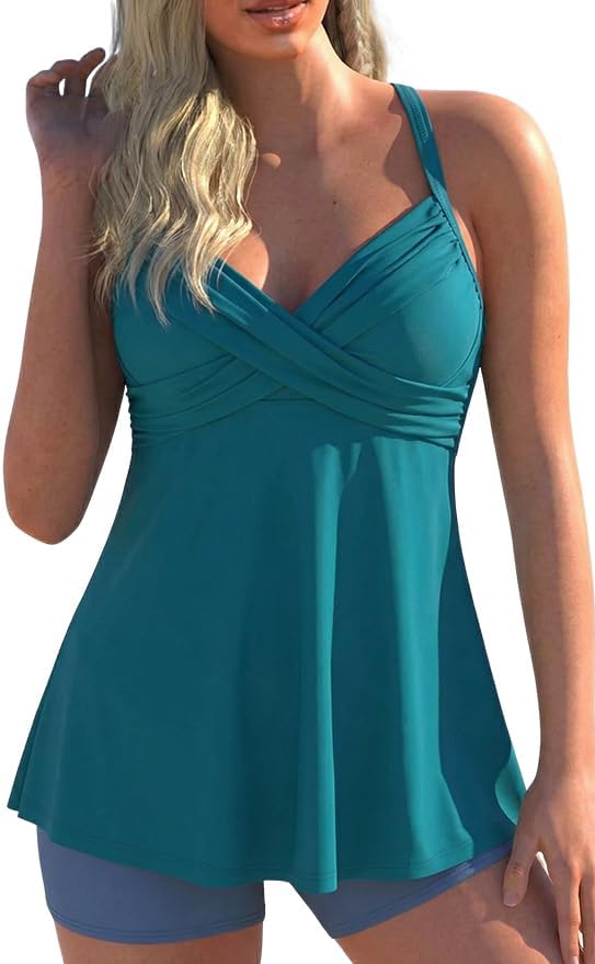 Hilor Women's Underwire Tankini Top Swimwear Twist V Neck Swimsuit for Big Busted Flared Flowy Bathing Suit