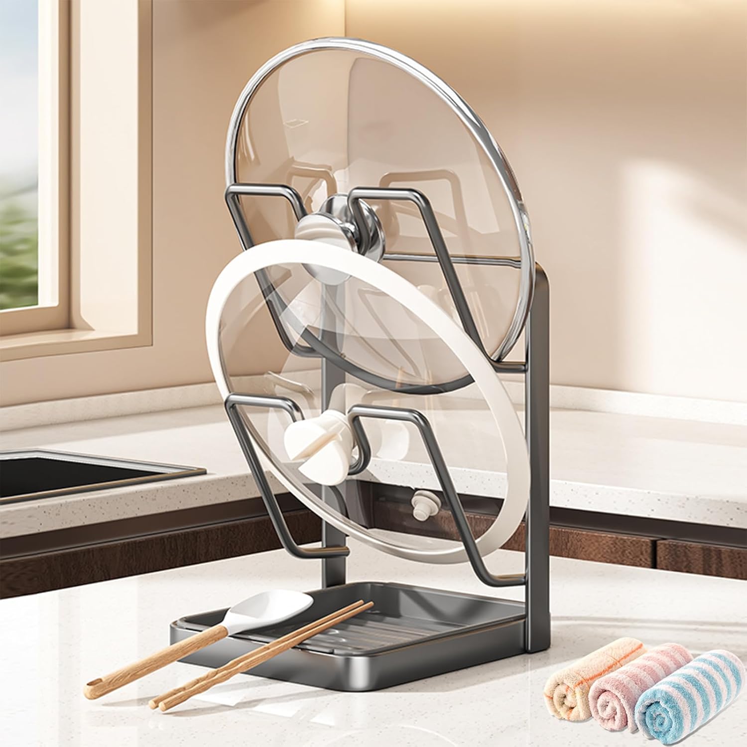 - 【STURDY & PRACTICAL DESIGN】Holds cast iron, glass, or stainless-steel lids securely without sagging or staining. The ABS drainage tray collects condensation and keeps everything clean and tidy