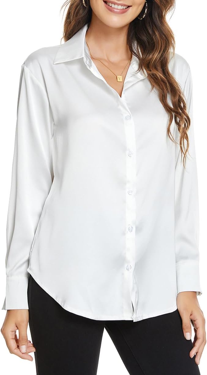 Womens Long Sleeve Satin Silk Button Down Shirts Casual Work Business Smooth Blouse