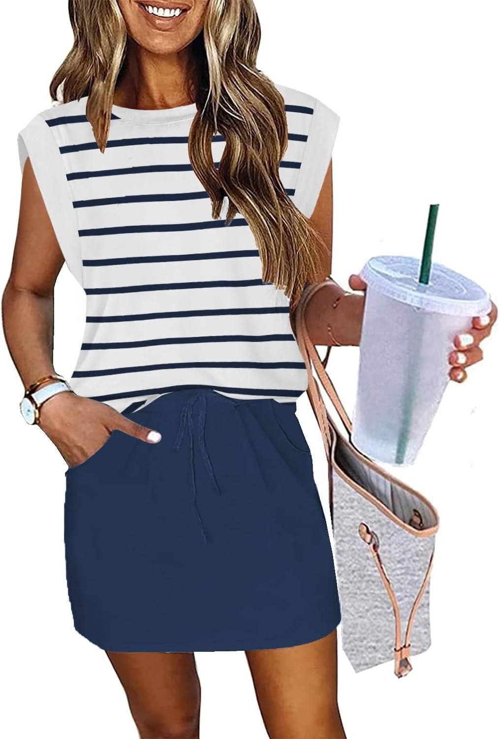 ETCYY NEW Womens Cap Sleeve Summer Dress Crew Neck Tie Front A-Line Dresses Double Layer Hem Mini Dress