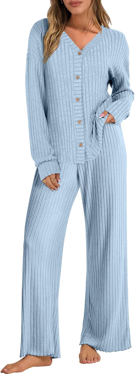 ANRABESS Women's 2 Piece Lounge Pajama Sets Ribbed Long Sleeve Button Top Matching Pants Sleepwear PJ Set 2025 Fall Outfits