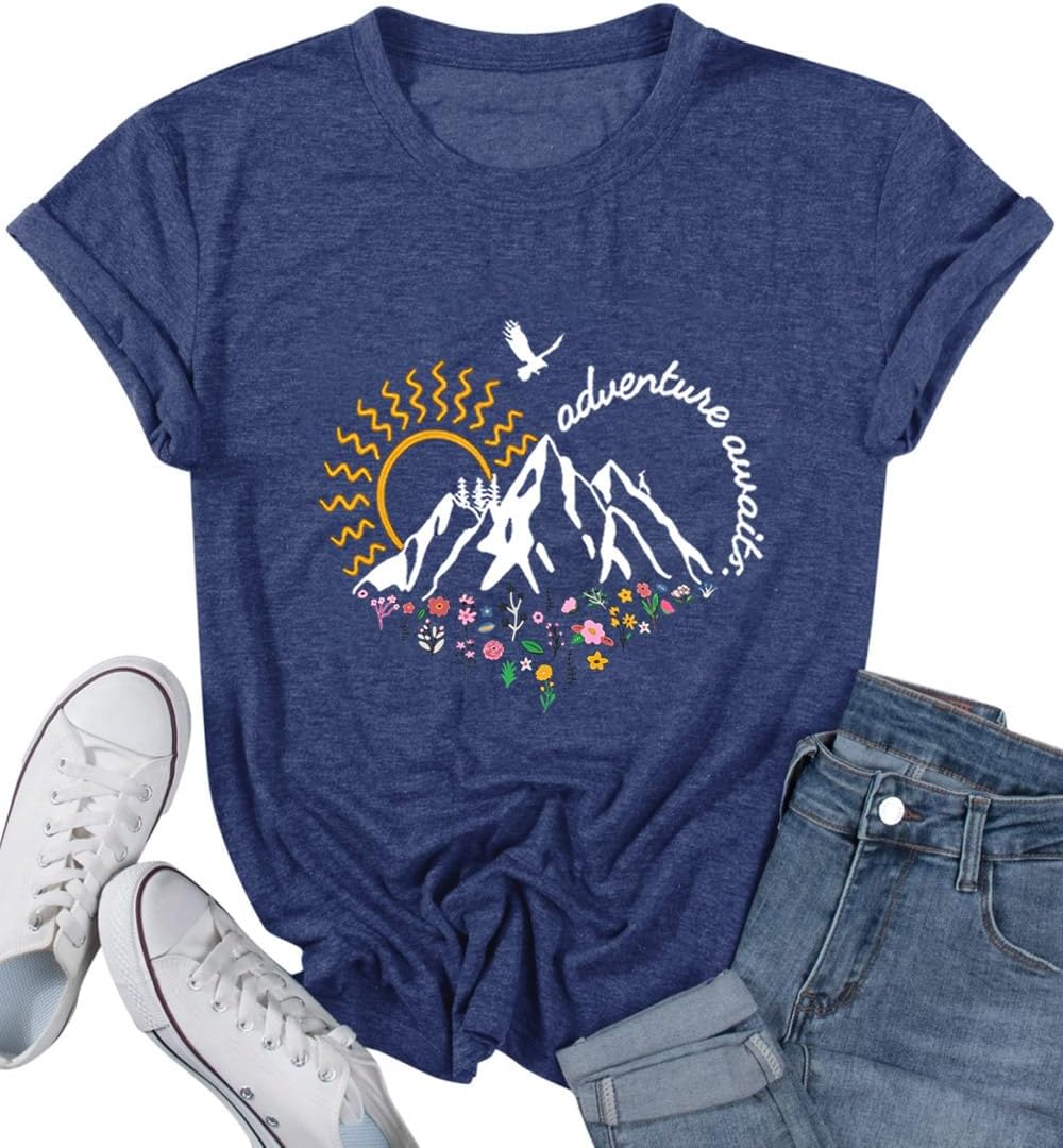 Adventure Awaits Shirts for Women Cute Sunrise Eagle Graphic Hiking T Shirts Outdoor Casual Short Sleeve Wildflower Tops