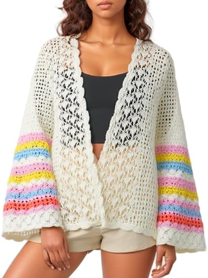 Bell Sleeve Crochet Cardigan for Women White | Lightweight Pointelle Knit Open Front Fall Cardigans | Meidum Size