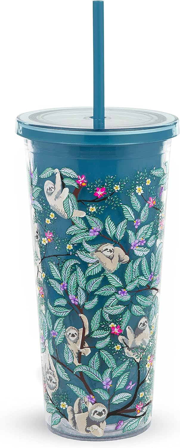 - Colorful Design: Tumbler is featured in the blue sloth print, Hanging Around, by Vera Bradley. Includes a solid blue straw/lid with a solid blue background.