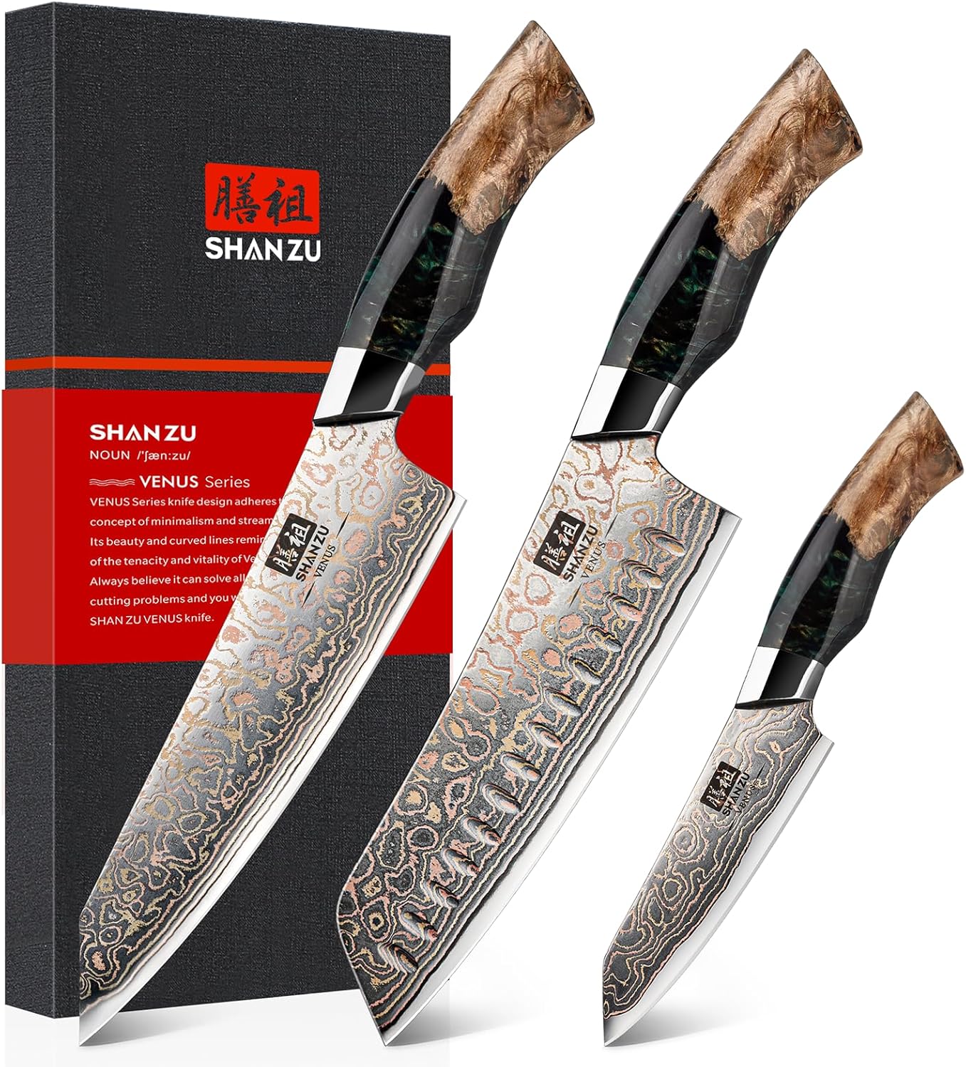 SHAN ZU Damascus Knife Set, Copper & Damascus Steel Japanese Kitchen Knives, High Carbon 33 Layer Hand Forged Utility Knife Professional Sharp Kitchen Knife with Maple Wood Handle