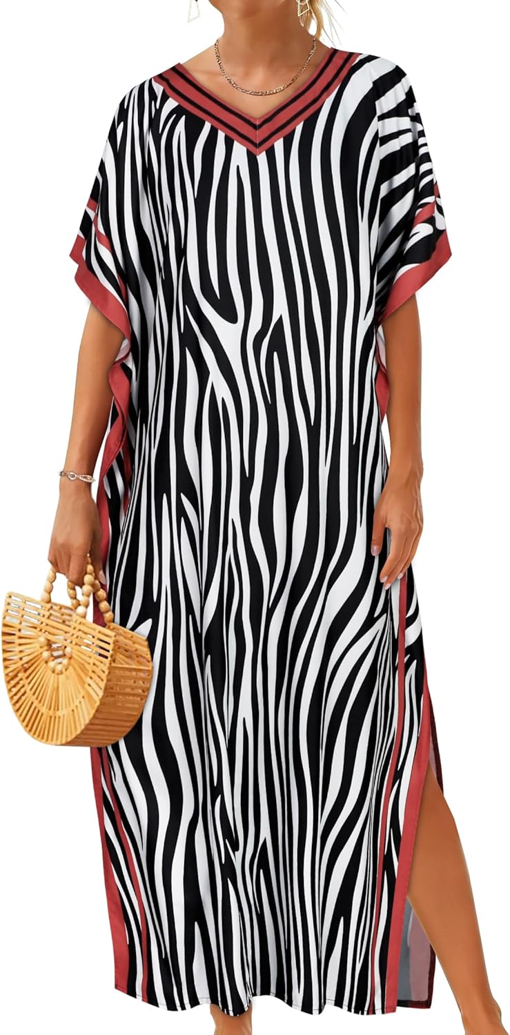 CHICGAL Kaftan Dresses for Women Oversized Long Batwing Sleeve Caftan V Neck Beach Cover Ups Summer Maxi Dress