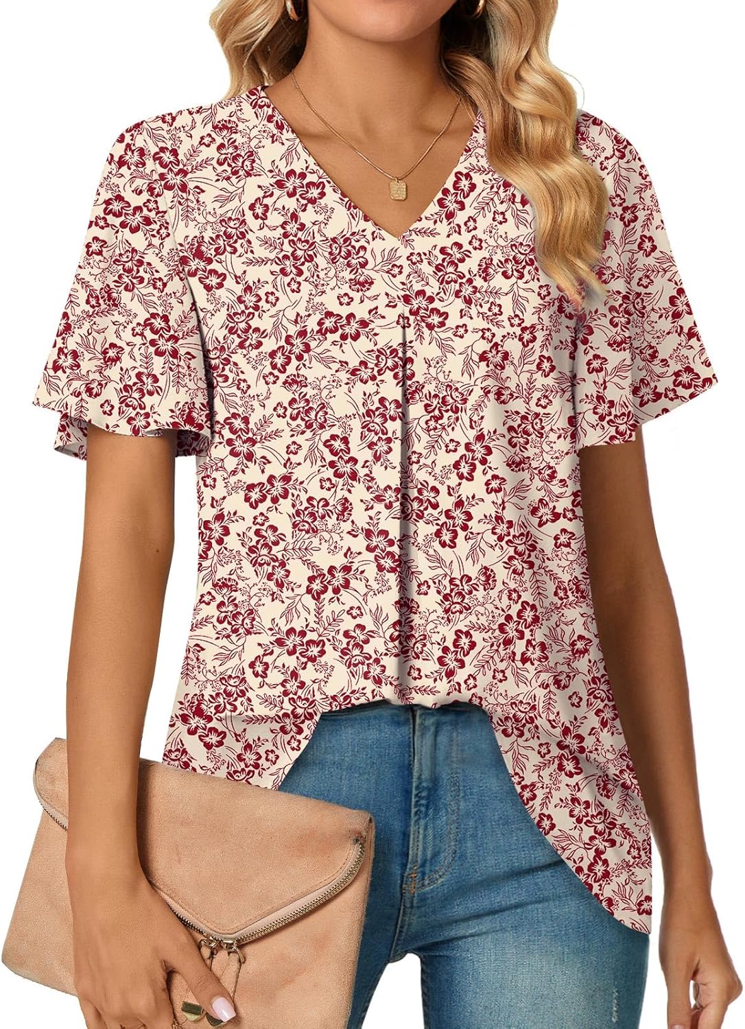 Anyally Women's Summer Dressy Chiffon Blouses V Neck Ruffle Short Sleeve Tunic Tops for Leggings Casual T-Shirts
