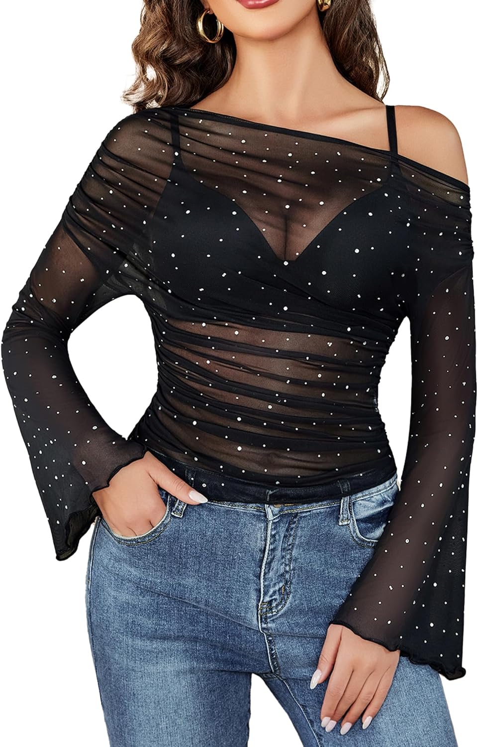 Avidlove Mesh Top for Women Long Sleeve Off The Shoulder Tops Sexy Clubwear Outfits Rhinestone Shirts S-XXL