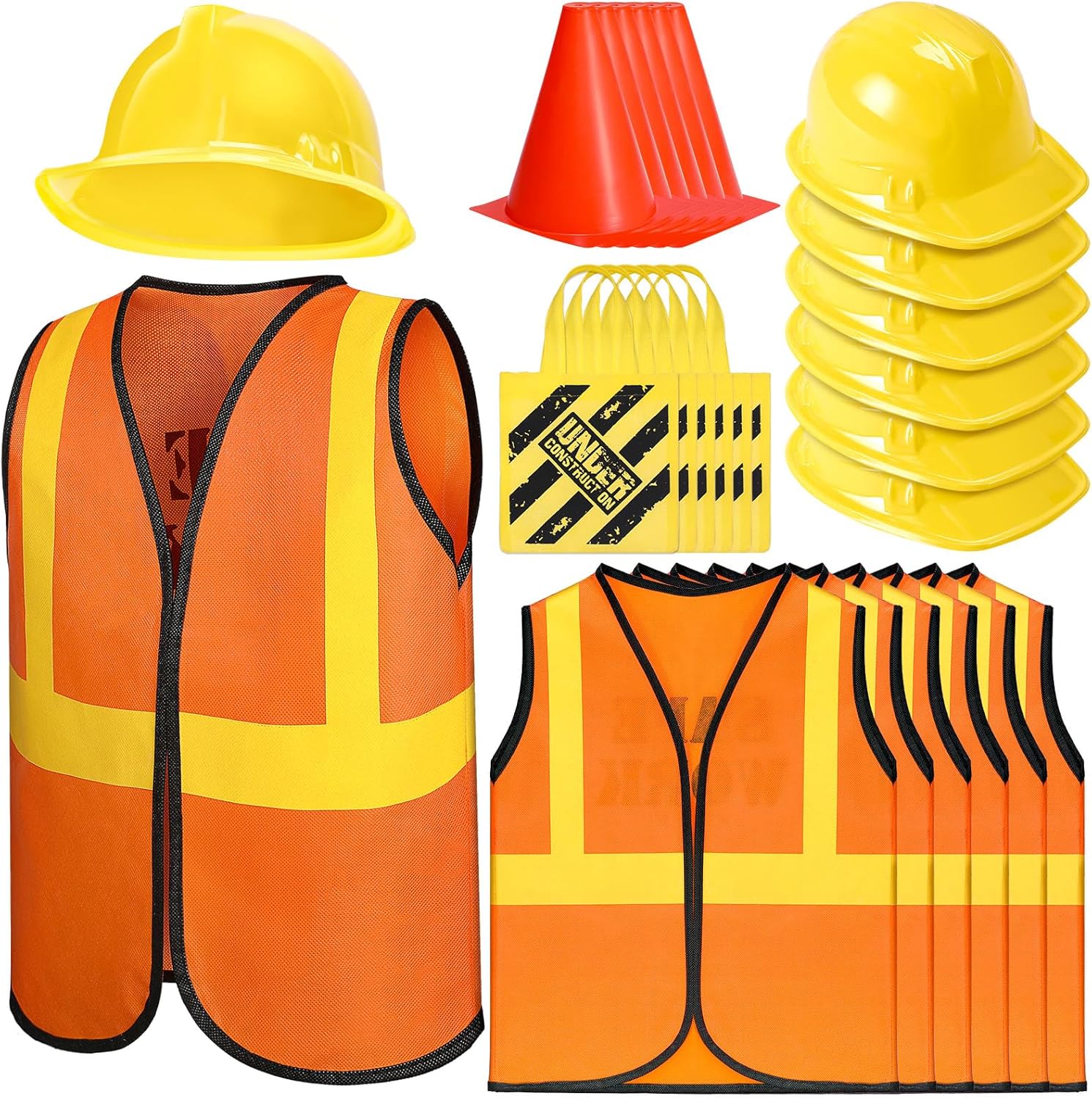 - What receive: package comes with 6 pieces construction vests, 6 pieces soft plastic construction yellow hats, 6 pieces orange traffic cones and 6 pieces under construction yellow tote bags, enough quantity to let more people involve in the costume party