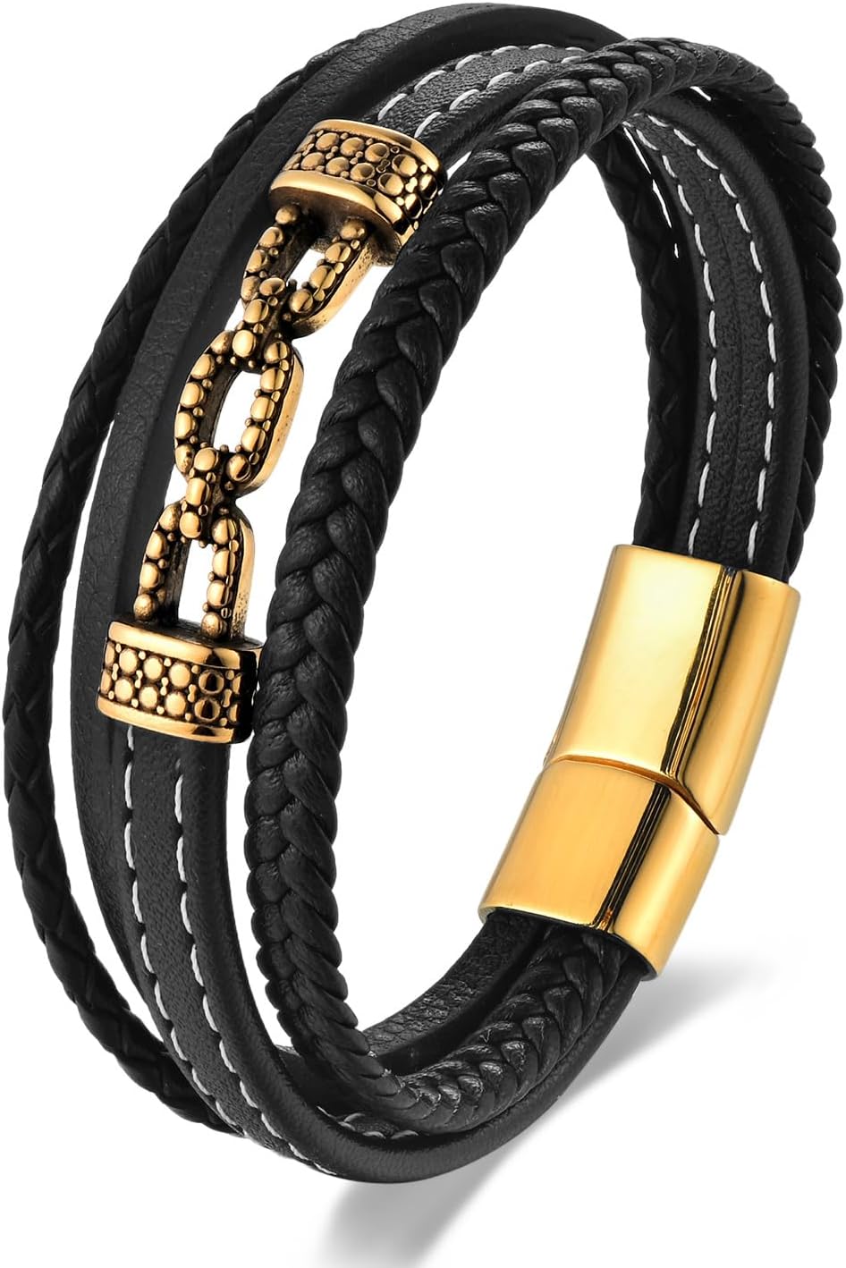 BIYONGDE Mens Braided Black Leather Bracelet with Golden Beaded Chain Accent, Multi-Strand Black Leather and Golden Color Plated Stainless Steel Bracelet for Men, Punk Rock Style