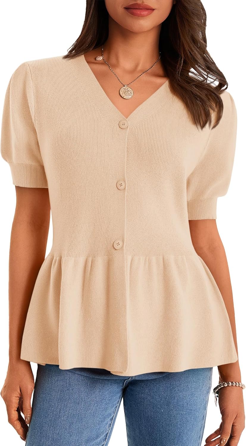 Cicy Bell Womens Short Puff Sleeve Sweater Cardigan V Neck Summer Button Down Sweaters Peplum Cute Knit Babydoll Tops