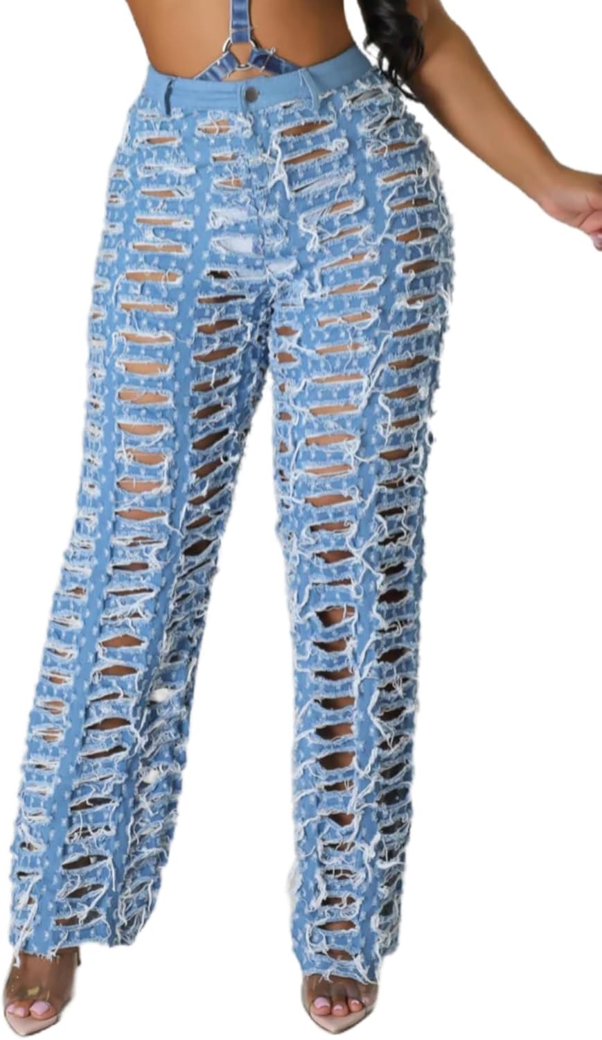 Vaceky Distressed Ripped Jeans Women Elastic Waist Straight Leg Denim Pants