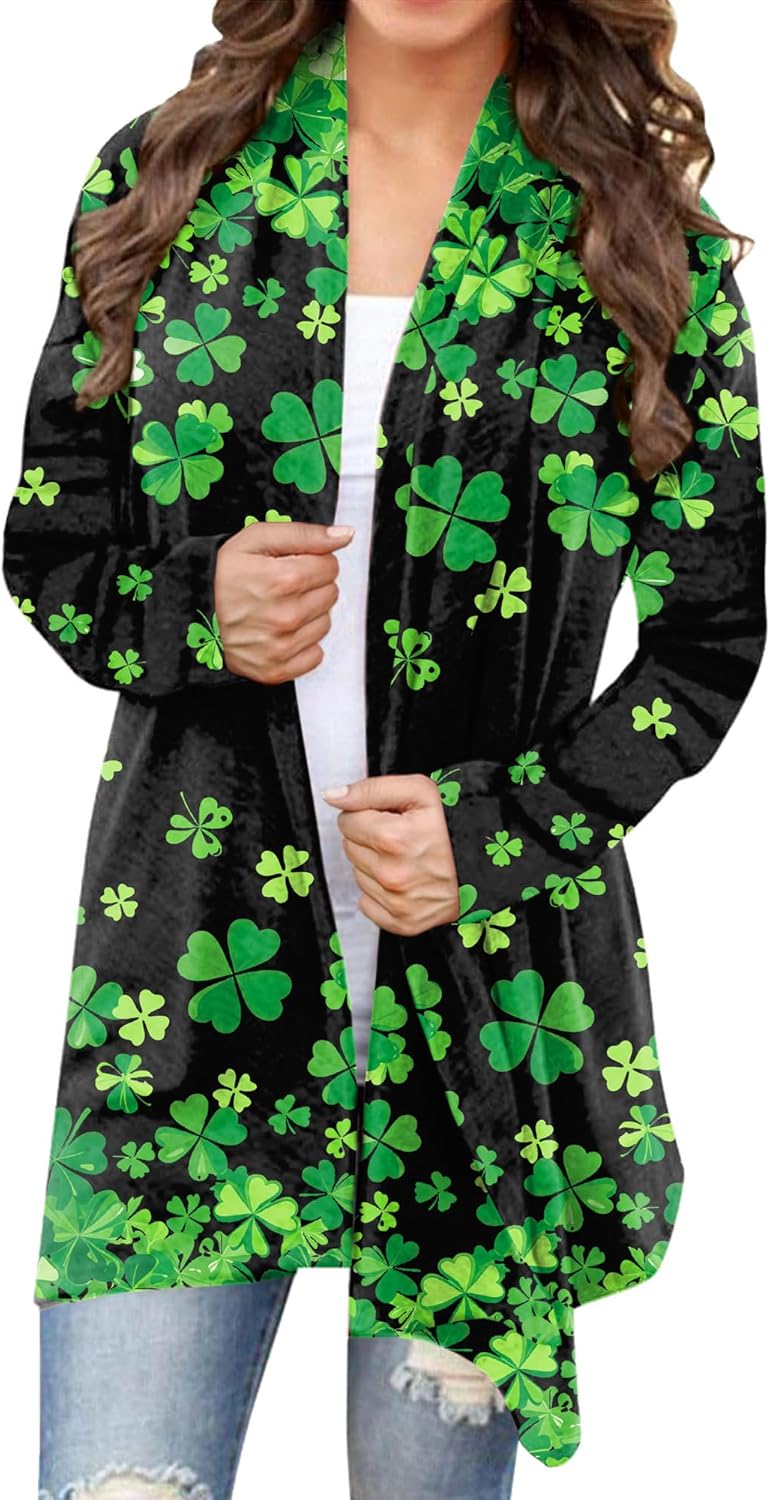 For G and PL Women's St. Patrick's Day Open Front Cardigan Shamrock Clover Shirts