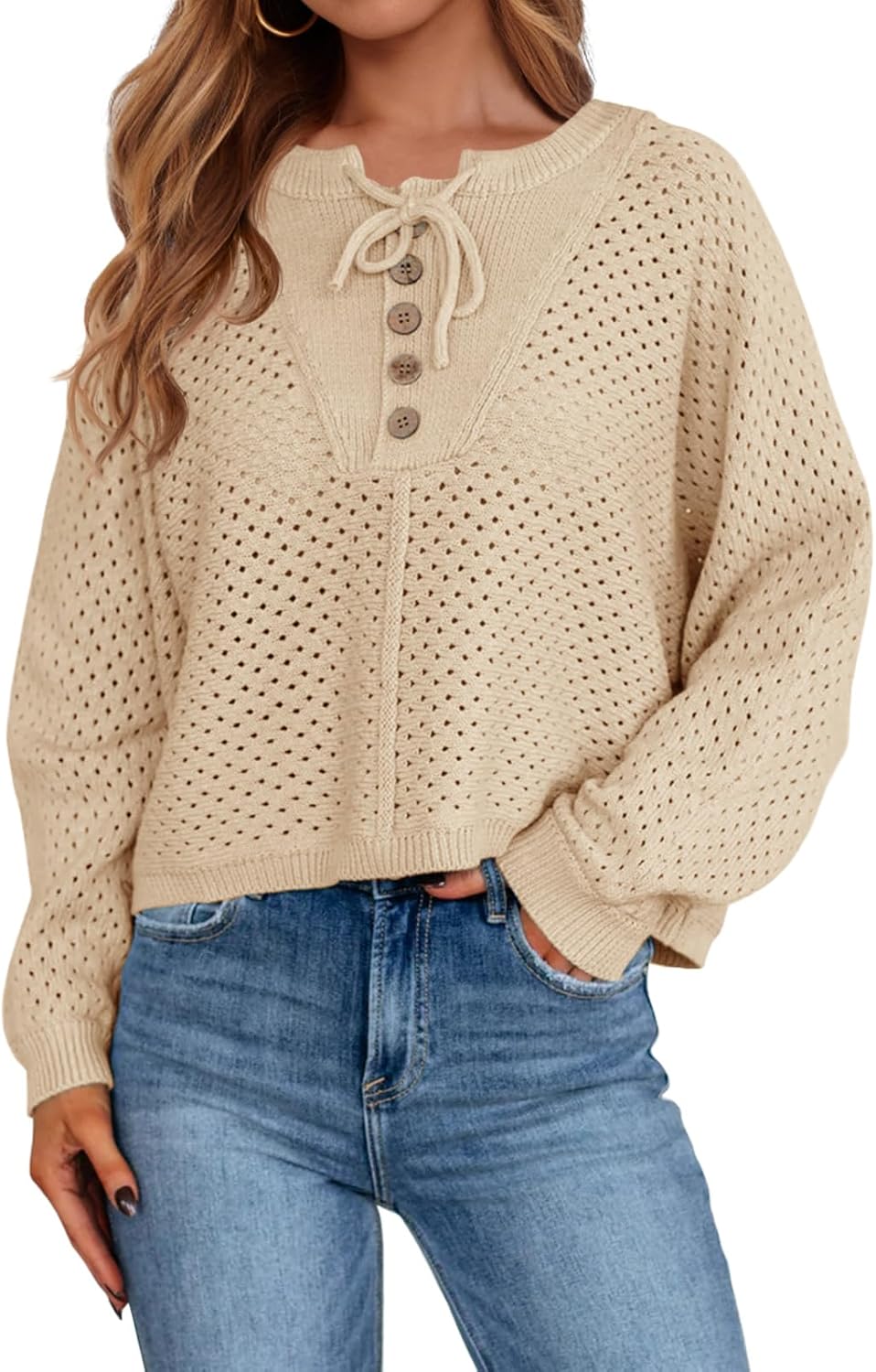 Saodimallsu Womens Crochet Button Sweaters Batwing Long Sleeve Henley Knit Shirts Drawstring Loose Trendy Sweater Tops