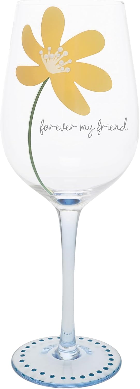 - IN-HOUSE DESIGN: The blue-tinted glass stem has raised puffy paint bumps circled at the bottom. A large yellow flower has a white center with white puff paint, and the "Forever My Friend" sentiment is placed on the front side of the glass.