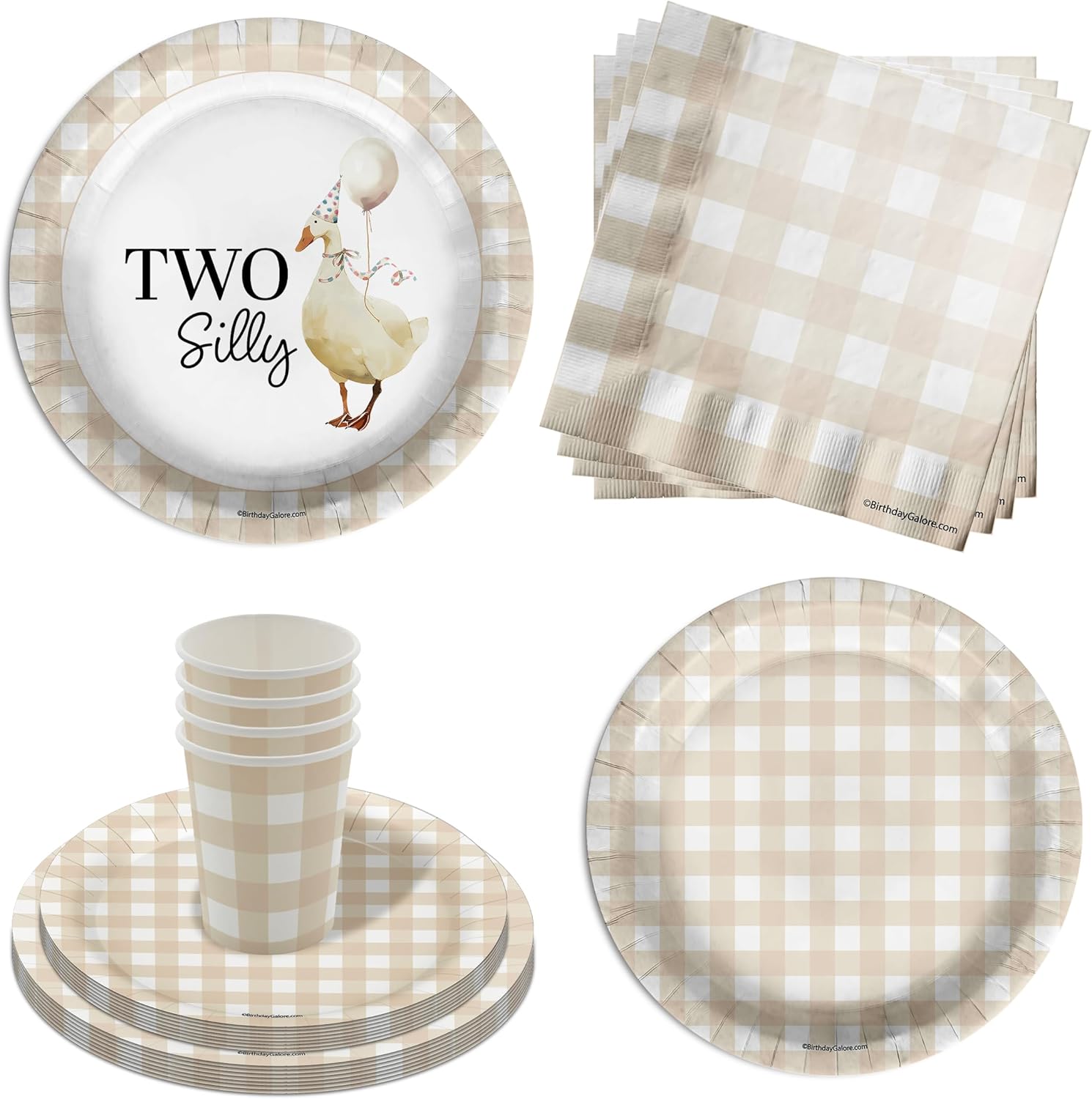 Two Silly Goose 2nd Birthday Party Supplies - 64 Piece Second Birthday Tableware Set Includes Large 9" Dinner Plates and 8" Dessert Paper Plates Napkins Cups - Kit for 16