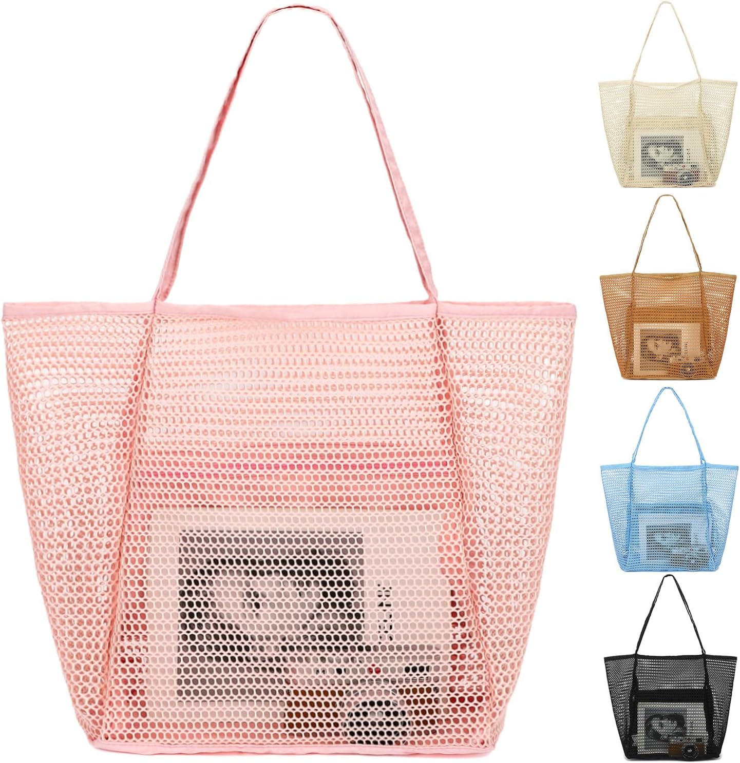 Mesh Beach Bag, Large Beach Tote with Zipper Pocket, Toys Pool Bag for Family Travel Vacation Cruise Essentials