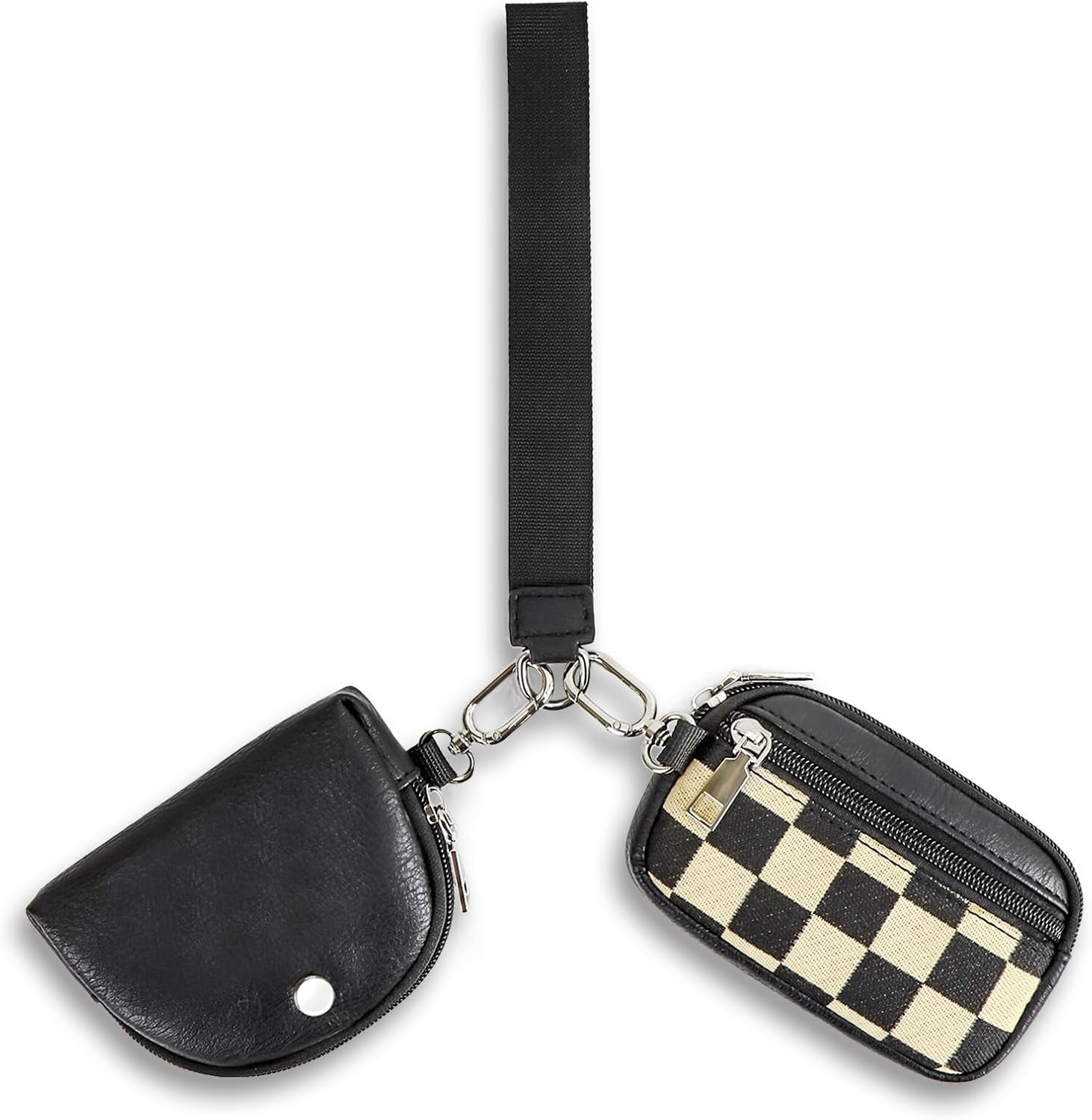 Checkered Dual Pouch Keychain Wallet for Women,Small Mini Zip Leather Coin Purse with Wrist Strap,wristlet hangbags,Black