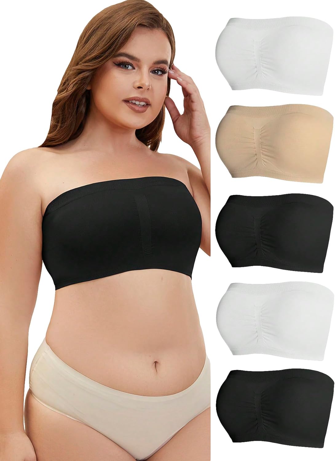MakeMeChic Women's Plus Size 5 Pieces Ruched Front Strapless Bra Seamless Stretchy Bandeau Tube Top Bra Set