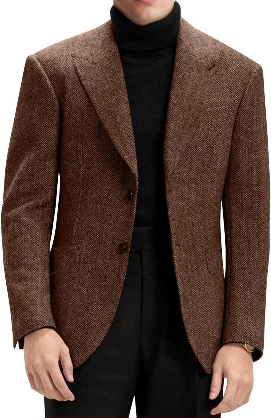 Mens Blazer Retro Herringbone Tweed Suit Jacket Men Wool Blend 2 Button Peak Lapel Men Sport Coats for Wedding Prom