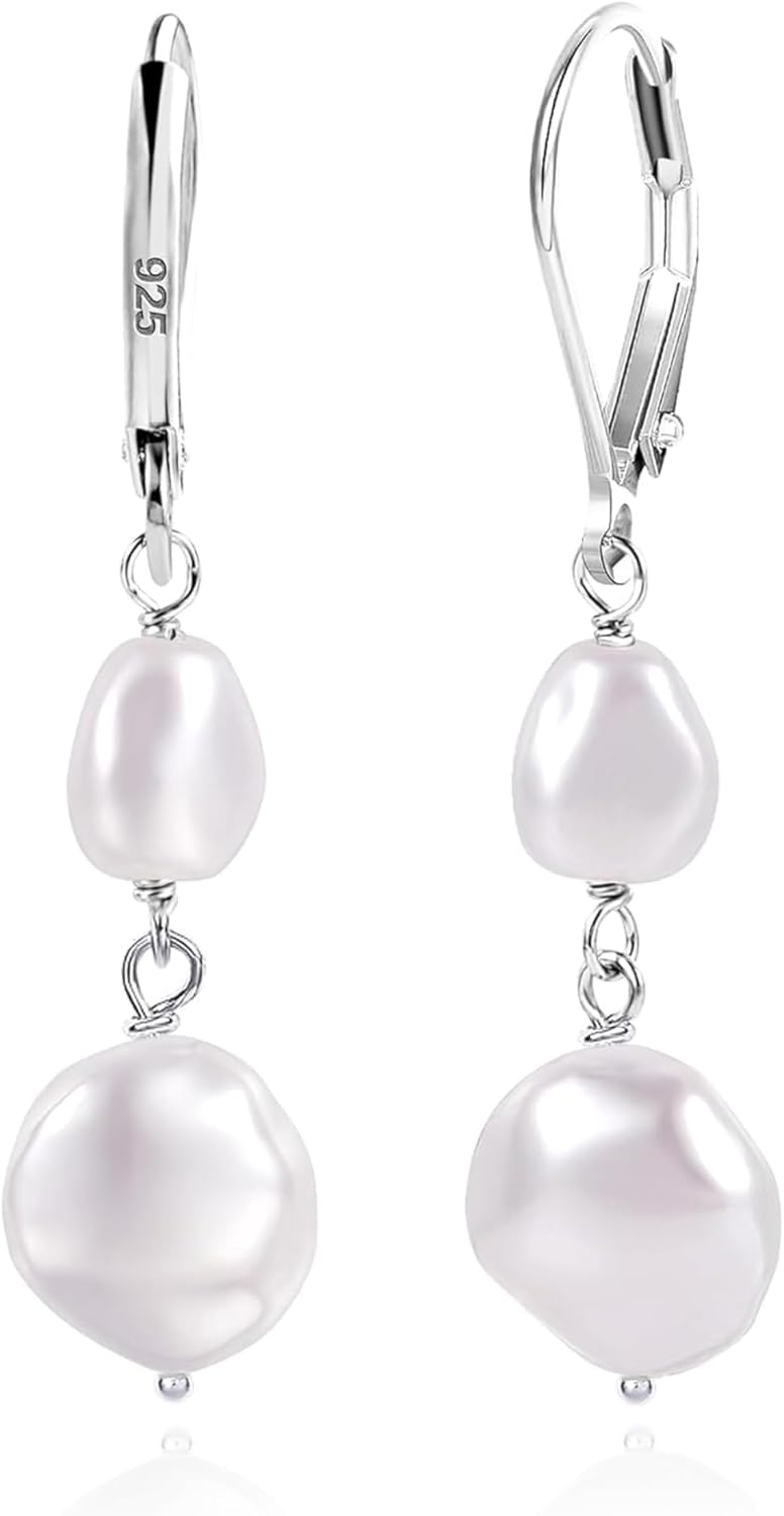 14K Gold Pearl Dangle Earrings for Women,925 Sterling Silver Double Pearl Drop Earrings,Leverback Irregular Pearl Hypoallergenic Earrings