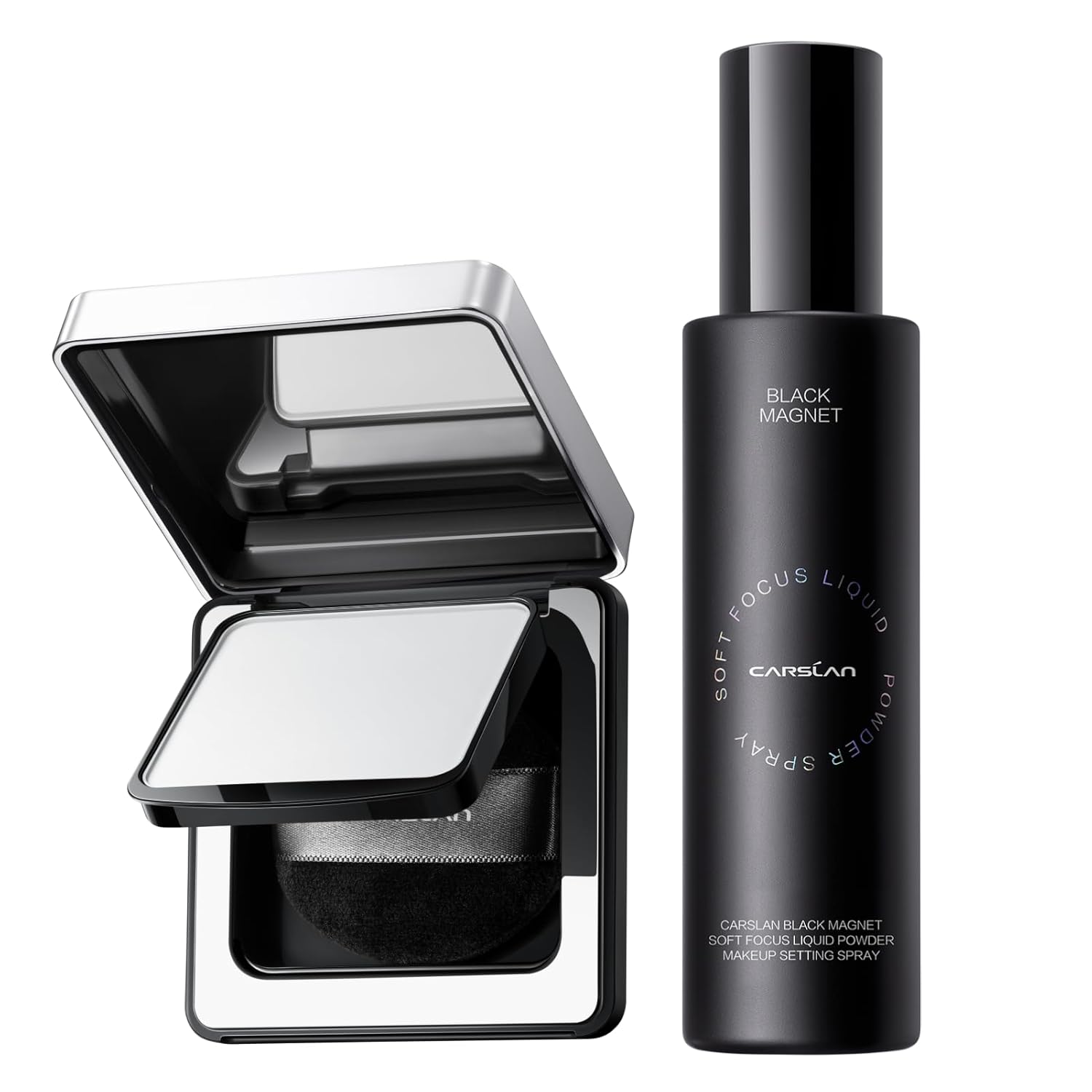 CARSLAN Black Magnet Soft Focus Pressed Powder+Liquid Powder Makeup Setting Spray, 24H Oil Control, Waterproof, Longwear Face Set Combo