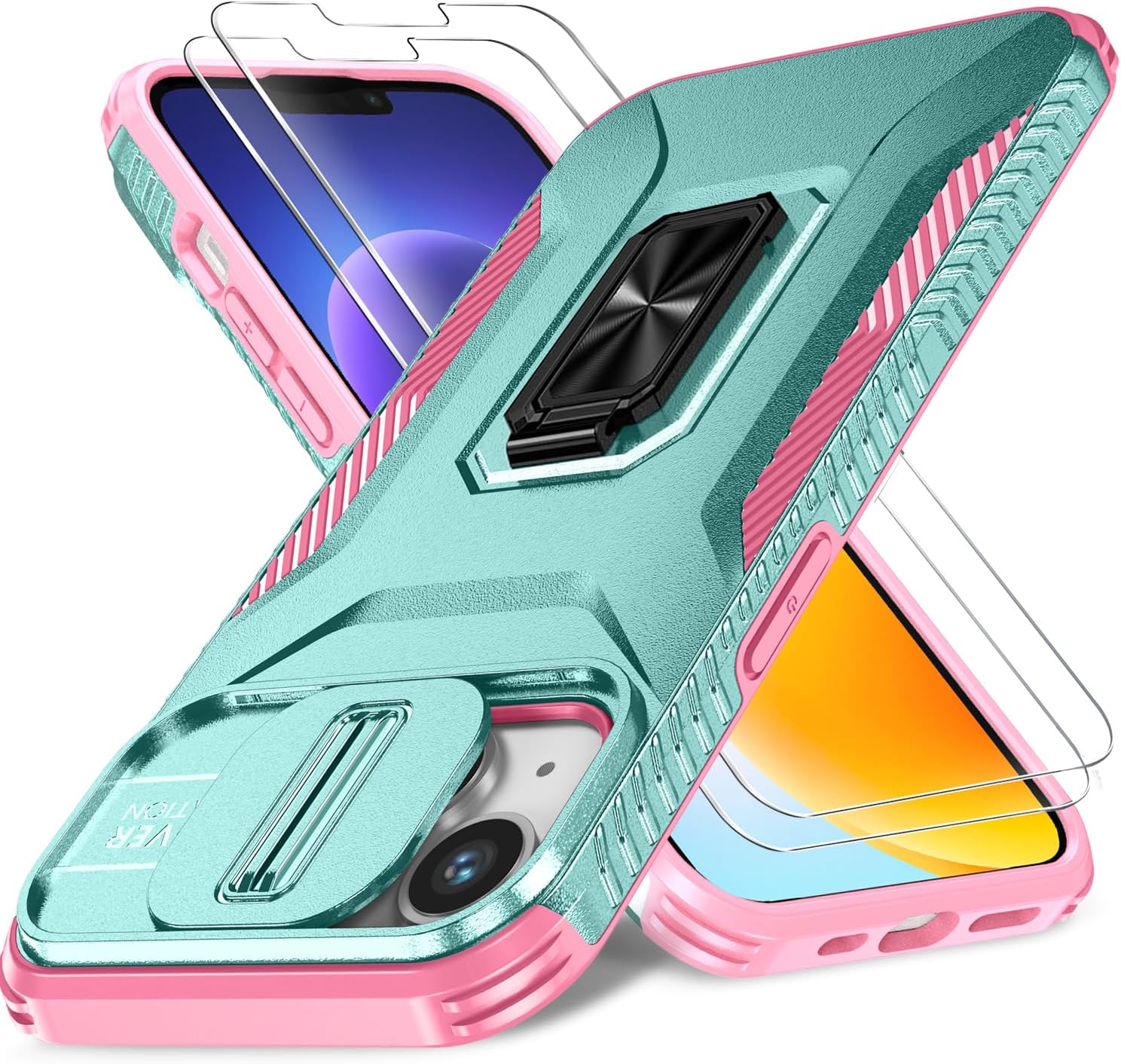 Case for iPhone 13/iPhone 14 6.1-Inch Slide Camera Cover+Screen Protector(2 Packs), Military Grade Shockproof Protective Cover, Rotated Ring Kickstand with Camera Protection (Celadon+Pink)