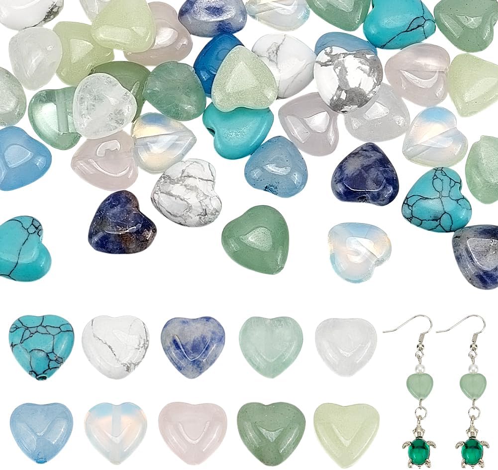 PH PandaHall 50PCS 10mm Heart Gemstone Beads, 10 Styles Natural Synthetic Stone Beads Rose Quartz Beads Crystal Spacer Beads for Christmas Bracelet Necklace Jewelry Making Crafts
