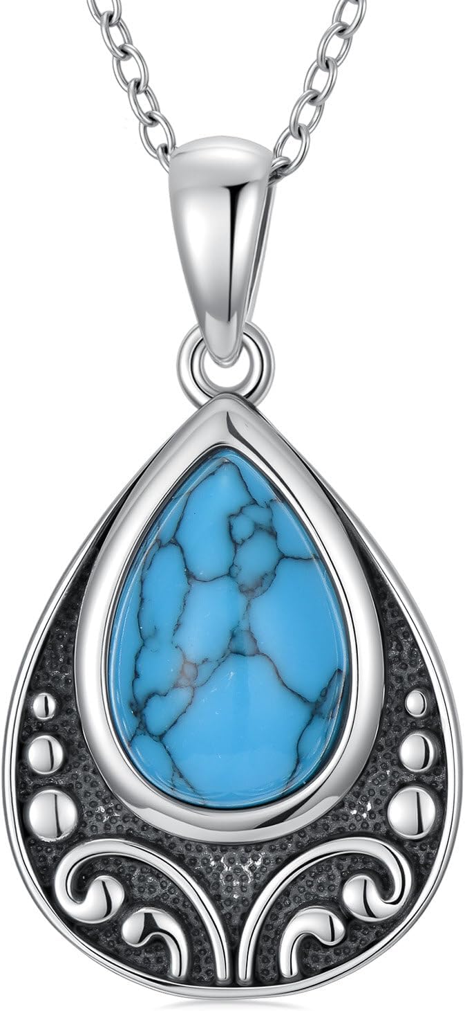 Natural Turquoise Necklace, 925 Sterling Silver Teardrop Pendant, Dainty Blue Gemstone Boho Jewelry Gift for Women