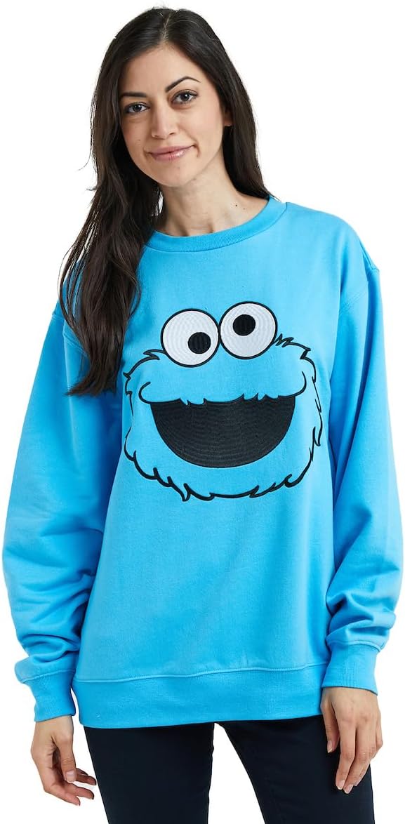 Sesame Street Big Face Cookie Monster Blue Crew Neck Long Sleeve Oversized Fleece Sweatshirt