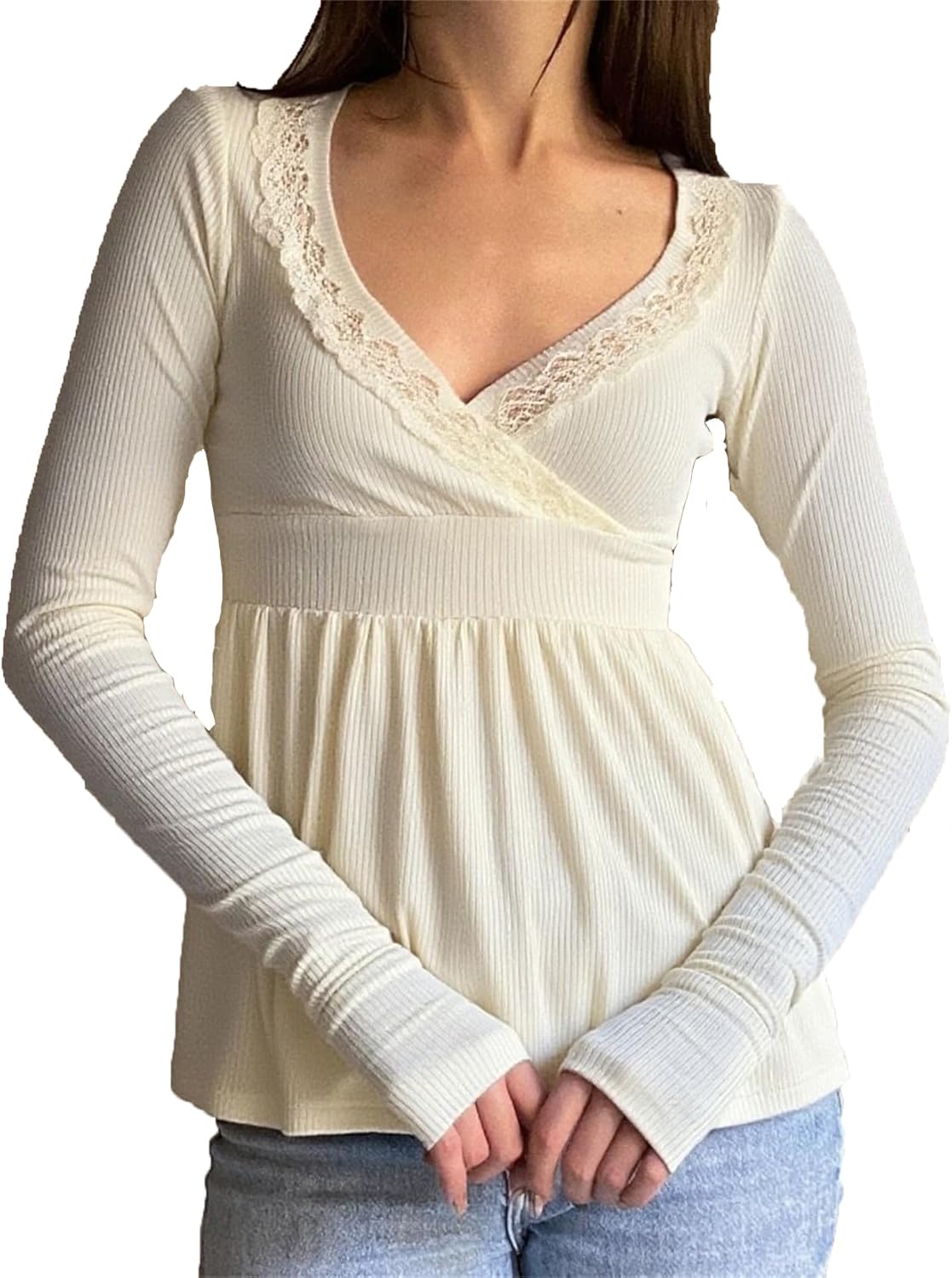Women Long Sleeve Lace Trim Shirt Cute Wrap V Neck Slim Fit Solid Color Babydoll Top Y2k Fairy Grunge Top Streetwear