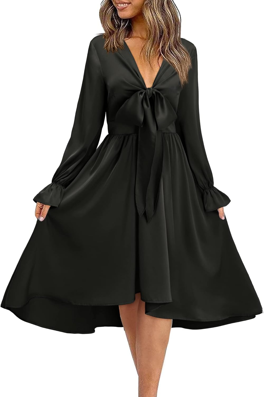 KILIG Women's Silky Satin Long Sleeve Tie Front Flowy Formal Wedding Guest Cocktail Party Evening Dresses