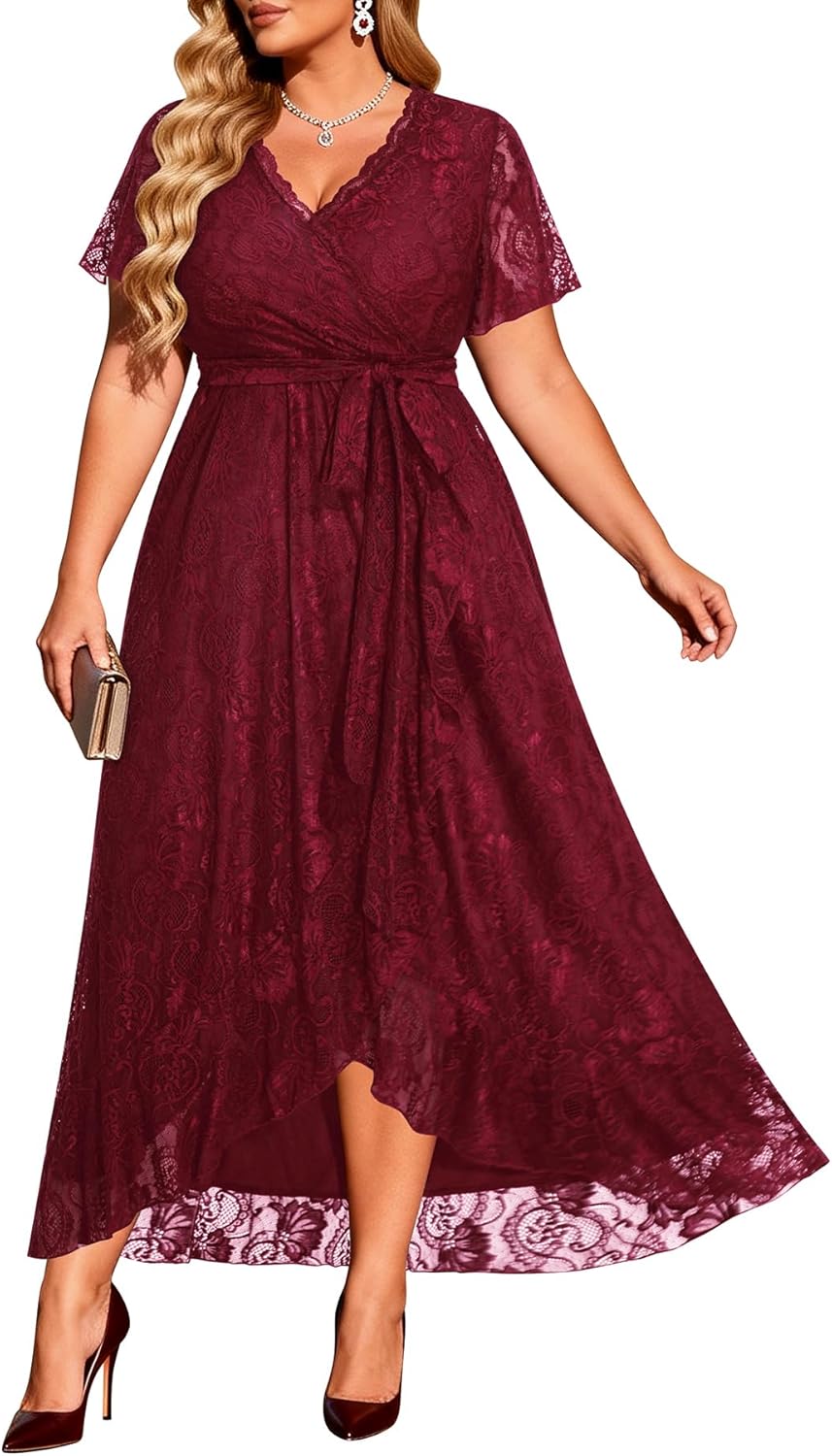 Plus Size Dresses Wedding Guest - Formal Cocktail Party Long Lace High Low Wrap V Neck Dress
