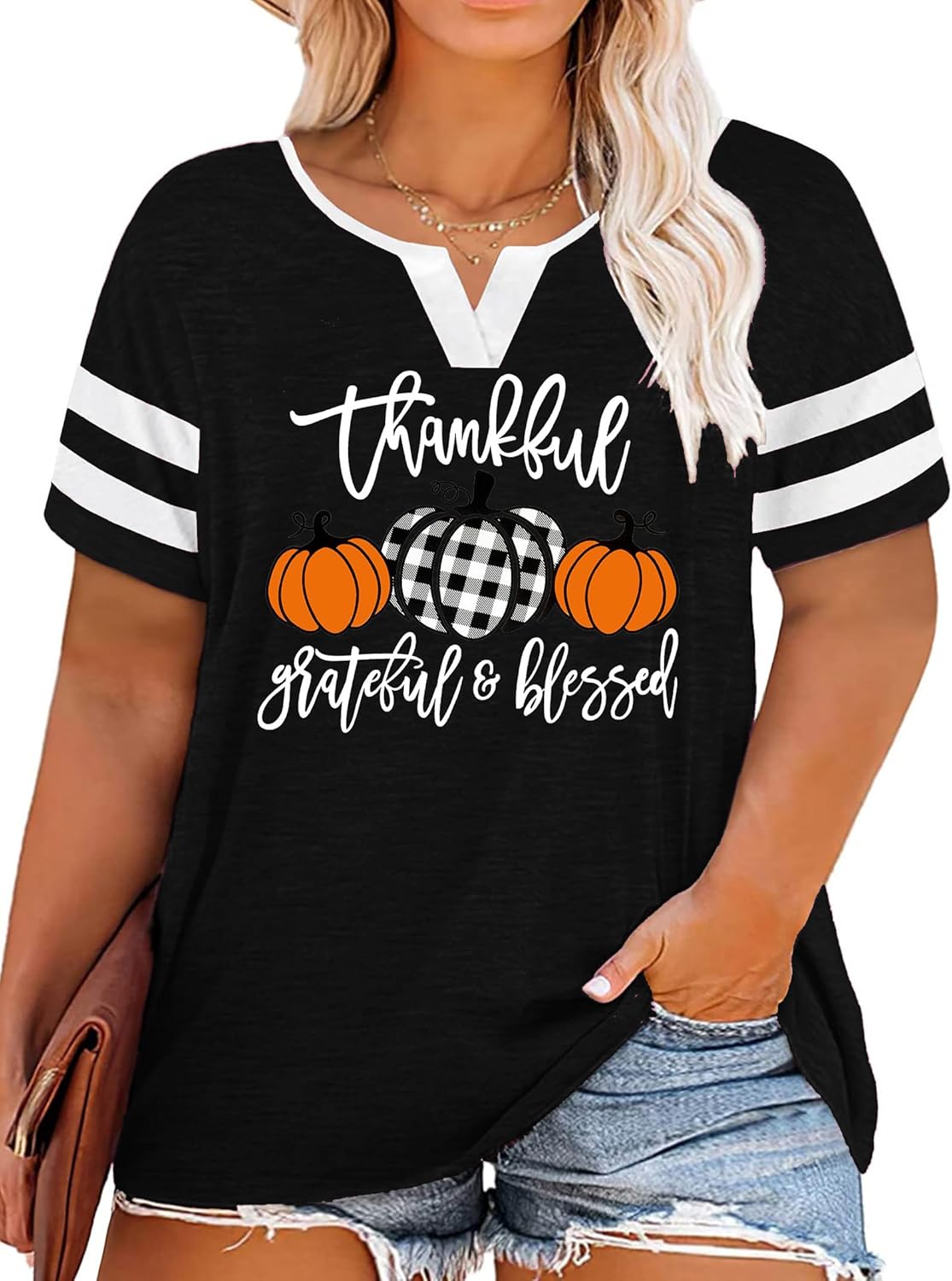 Plus Size Thanksgiving Shirts Women Thankful Grateful Blessed Shirt Leopard Pumpkin Print Casual Fall Tops