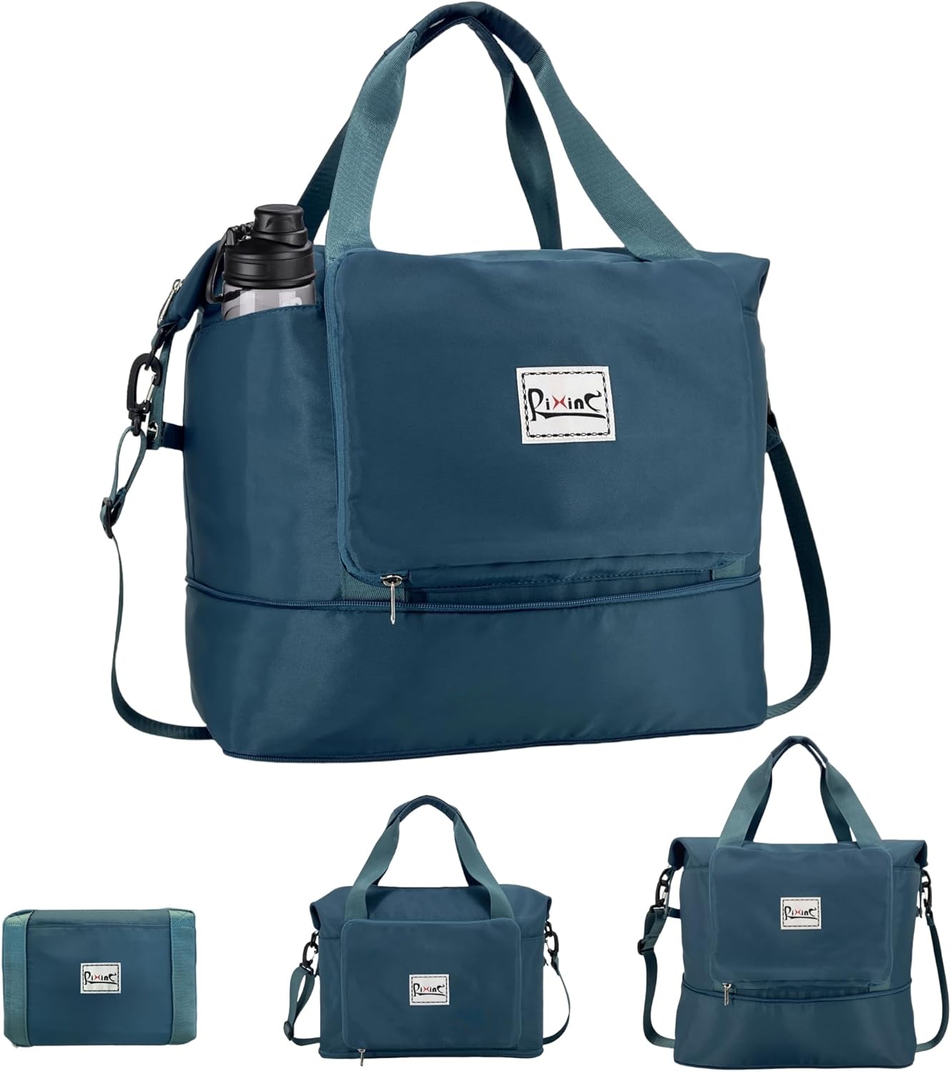 Foldable Travel Duffle Bag with Multiple Pockets, 40L Expandable Weekender Bag for Women, Overnight Carry On Gym Tote with Water Bottle Holder (Peacock Blue)
