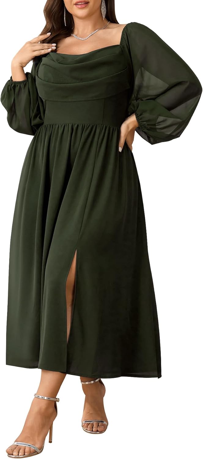 Women's Plus Size Dress Chiffon Long Sleeve Cowl Neck Wedding Guest Cocktail Party Maxi Dress
