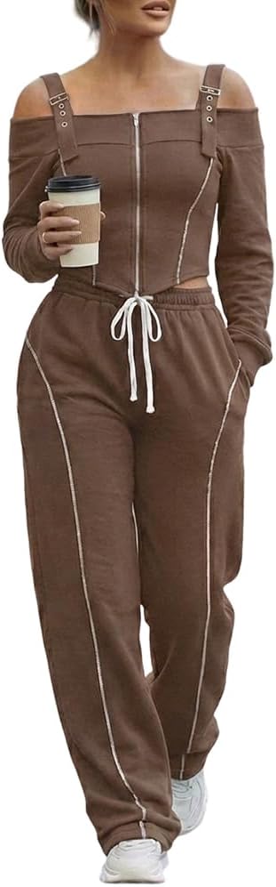 CHICME Two Pieces Sets for Women Spring Cold Shoulder Long Sleeve Tops Wide Leg Pants Matching Lounge Sets Airport Outfit
