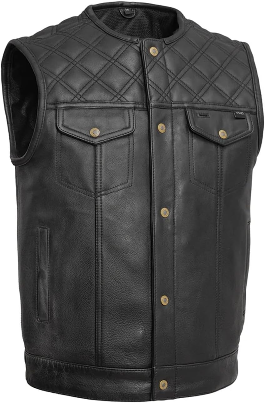 First Mfg Co Men’s Motorcycle Leather Vest, Club Style Premium Leather Biker Vest, Dual Zipper & Snap Closure