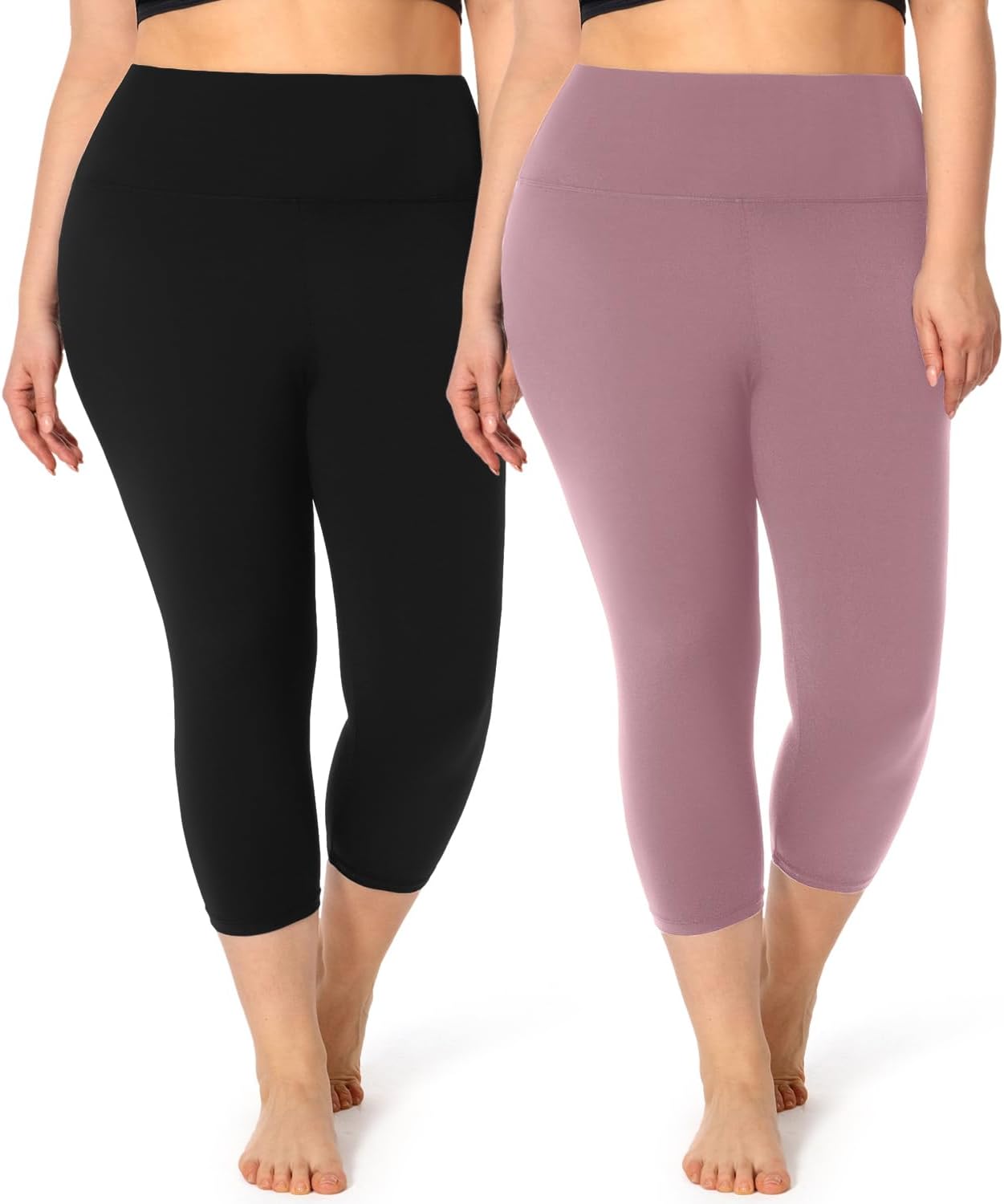 2 Pack Plus Size Capri Leggings for Curvy Women -1X-4X High Waisted Tummy Control&Soft Yoga Workout Gym Tights Pants