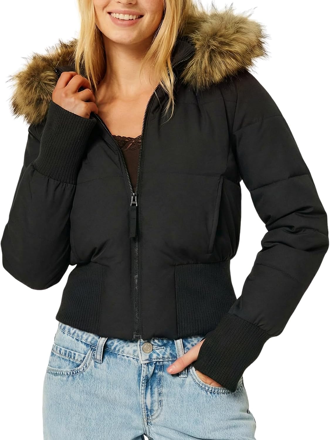 Wyeysyt Women's Cropped Puffer Jacket Winter Quilted Jacket with Faux Fur Trim Hood Bomber Coat