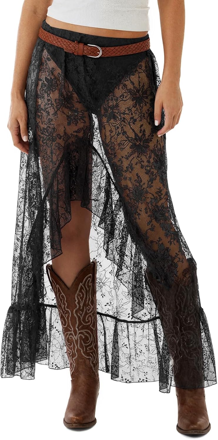 Cicy Bell Womens Lace Maxi Skirt Summer High Low Asymmetrical Sheer Y2K Sexy Beach Cover-up Long Skirts